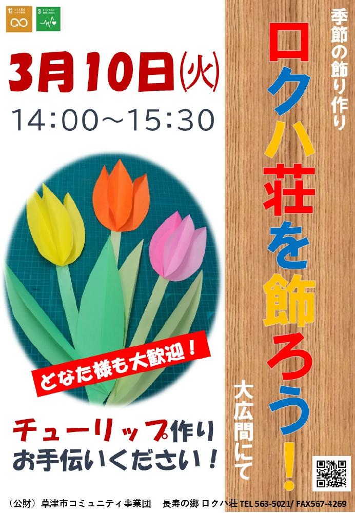 | 『ロクハ荘を飾ろう!』 毎月1回、利用者様とロクハ荘を彩る 飾り作りをしています。 今回は 一足早く春を・・・ 折り紙、画用紙を使い 色とりどりの『チューリップ』を作ります! お時間がありましたら 是非お手伝いくださいね(^▽^) 3月10日㈫ 14:00~15:30 大広間にて お待ちしております! |